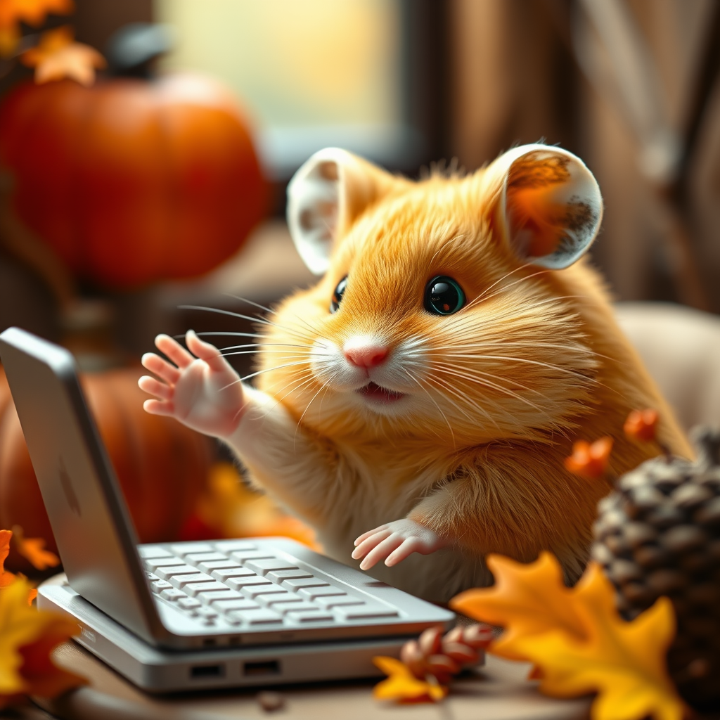 A captivating portrait of an incredibly charming and lovable golden hamster waving goodbye while diligently typing a blog post, featuring a smooth, flawless expression, evoking the whimsical style of Mark Ryden, Pixar, and Hayao Miyazaki. The scene is richly detailed with harvest autumn hues, and bathed in stunning cinematic lighting. Rendered in 3.5mm diorama macro photography, the image boasts hyperrealistic detail, embodying the artistic essence of concept art with sharp focus in an 8k resolution setting.