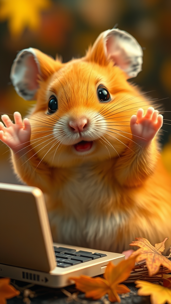 A captivating portrait of an irresistibly charming golden hamster who is waving farewell while typing out a whimsical blog entry, showcasing a flawlessly smooth face; inspired by the enchanting styles of Mark Ryden, Pixar, and Hayao Miyazaki. The image is captured in sharp focus and represents concept art imbued with the vibrant hues of autumn harvest. Intricate detailing brings a hyperrealistic quality with cinematic lighting, utilizing the precision of 3.5 mm diorama macro photography in stunning 8k and 4k resolution.