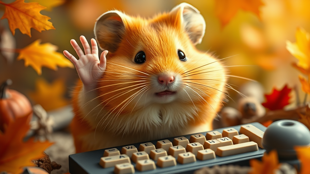 A captivating portrait of an irresistibly charming golden hamster, waving goodbye as it types on a tiny keyboard for its blog, showcasing a smooth and flawless face with a whimsical touch. Inspired by the imaginative styles of Mark Ryden, Pixar, and Hayao Miyazaki, the scene captures a fantasy essence. The design displays intricate detail and harvest fall hues, enhanced by cinematic lighting. The hamster's fur and surroundings are depicted in hyperrealistic detail, reminiscent of diorama macro photography. Shot in stunning 8K and 4K resolutions, this artwork combines the enchantment of character design with the richness of autumnal vibrancy.