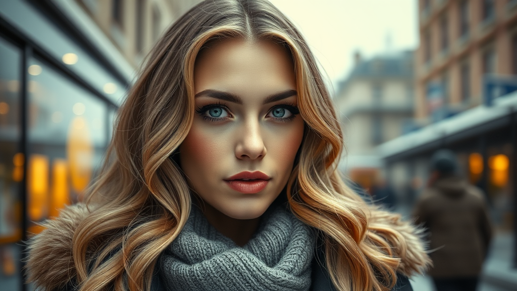 A captivating portrait of Gal Gadot in winter attire, showcasing long wavy blonde hair with subtle freckles gracing her beautifully symmetrical face. Her natural makeup enhances her elegance against a backdrop of a stunning modern urban upscale setting. The portrait features ultra-realistic elements, drawing from concept art with intricate and highly detailed sharp focus achieved through an f/1.8, 85mm lens, captured in a medium shot. The scene exudes elegance with volumetric fog adding depth and dimension. With trending potential on Instagram and Tumblr, the image is rendered in cinematic quality HDR, 4k to 8k resolution, ensuring a realistic portrayal. A sense of sophistication and style pervades, emphasizing the subject's individuality and charm.