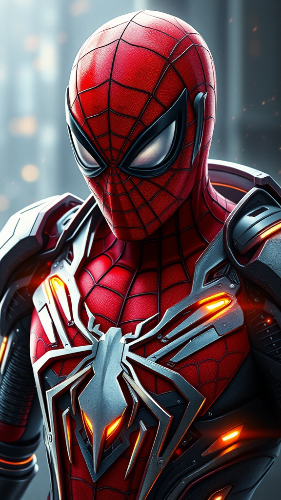 A captivating portrait of Spider-Man in advanced cybernetic battle armor, showcasing a sci-fi theme with luminescent intricate details across a full-body display. This elegant and highly detailed digital painting emphasizes sharp focus and a smooth finish, echoing the style of concept art found on ArtStation. Drawing inspiration from renowned artists like Artgerm, Greg Rutkowski, and Alphonse Mucha, the artwork balances aesthetics with a futuristic vision. The composition is visually striking, avoiding imperfections and maintaining precise anatomy, proportions, and focus. The artwork also ensures clean and polished edges, free of additional artifacts or distortions, presenting a well-composed and harmonious visual experience.