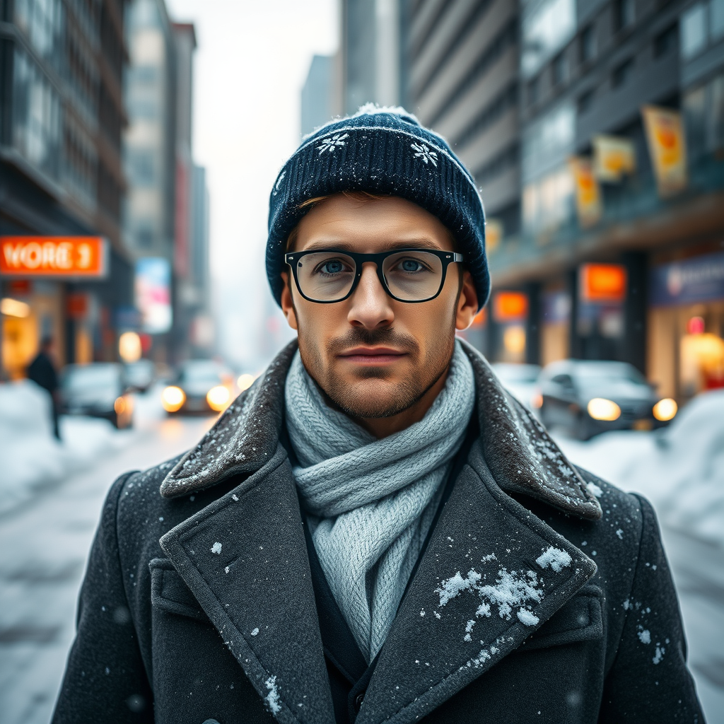 A captivating portrait photograph of a striking Norwegian man dressed in sophisticated winter attire, positioned effortlessly on a snowy city street amidst a vibrant, modern urban landscape. This ultra-realistic concept art piece is elegantly crafted with high intricacy and detail. The composition features a sharp focus and a balanced depth of field, shot with an 85mm lens at f/1.8. The medium shot captures an inviting ambiance with bright, soft diffused lighting, enhanced by subtle volumetric fog that adds depth and mystery. This image is perfectly suited for trending platforms like Instagram and Tumblr, presented in stunning HDR quality suitable for 4k and 8k displays, incorporating artistic flair while maintaining a core essence of modern, upscale sophistication.