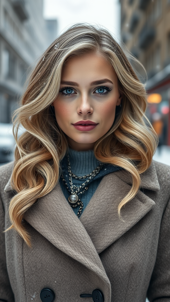 A captivating portrait photograph of a stunning Norwegian woman with luxurious wavy blonde hair and delicate freckles, her face impeccably symmetrical, adorned with subtle natural makeup. She stands in a chic winter ensemble amidst a snow-draped urban landscape, exuding sophistication. The scene is hyper-realistic, grounded in concept art with an emphasis on elegance and meticulous detailing. Every feature is sharply in focus, creating a medium shot with a striking depth of field at f/1.8 using an 85mm lens. The ambiance is softened by bright diffused lighting and a gentle veil of volumetric fog. This image trends on platforms like Instagram and Tumblr, captured in vibrant HDR 4K and 8K quality with subtle creative nuances to enhance its visual appeal.