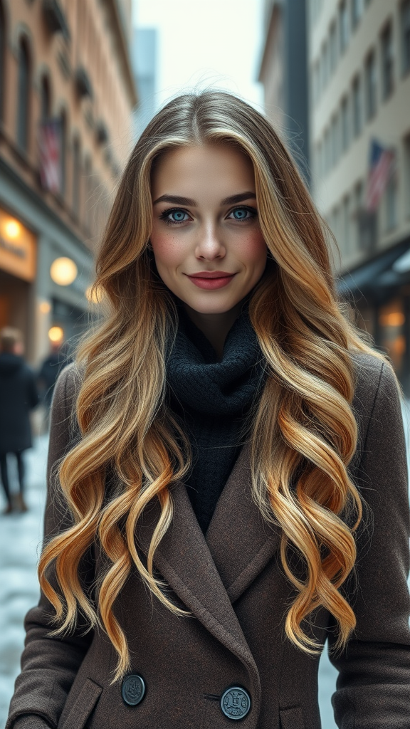A captivating portrait photograph of a stunning Norwegian girl in chic winter clothing, her long, wavy blonde hair cascading over her shoulders. She has a flirty, enchanting expression and a face adorned with freckles, perfectly symmetrical and highlighted with a touch of natural makeup. She stands on a snowy city street, surrounded by a modern, upscale urban environment. The photograph is ultra-realistic with concept art influences, elegantly detailed with sharp focus and depth of field, shot with an f/1.8 aperture on an 85mm lens. The composition is centered and professionally color graded, featuring a bright, soft, diffused light that enhances the scene's volumetric fog. This image is trending on Instagram and Tumblr, captured in high dynamic range, 8k resolution, ensuring a visually striking portrayal.
