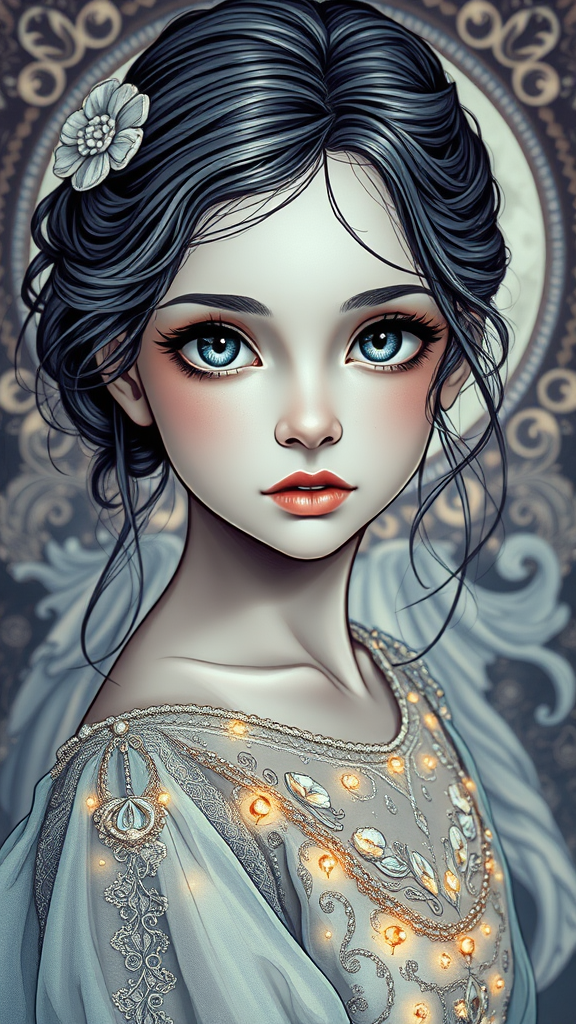A captivating portrayal of a single girl with an exquisitely detailed face, perfect eyes that captivate, adorned in a shimmering dress that glows with elegance. Her presence is highlighted by intricate line art set against an abstract art nouveau background, creating an enchanting atmosphere. The artwork is captured in sharp focus, showcasing ornate details in stunning 8k UHD HDR quality. Subtle creative elements are woven into the piece, avoiding distractions like duplicates or unnecessary mutations. The composition is pristine, with the subject wholly in frame and free from imperfections such as blurriness, artefacts, or intrusive text. The overall result is a mesmerizing and purely artistic vision.