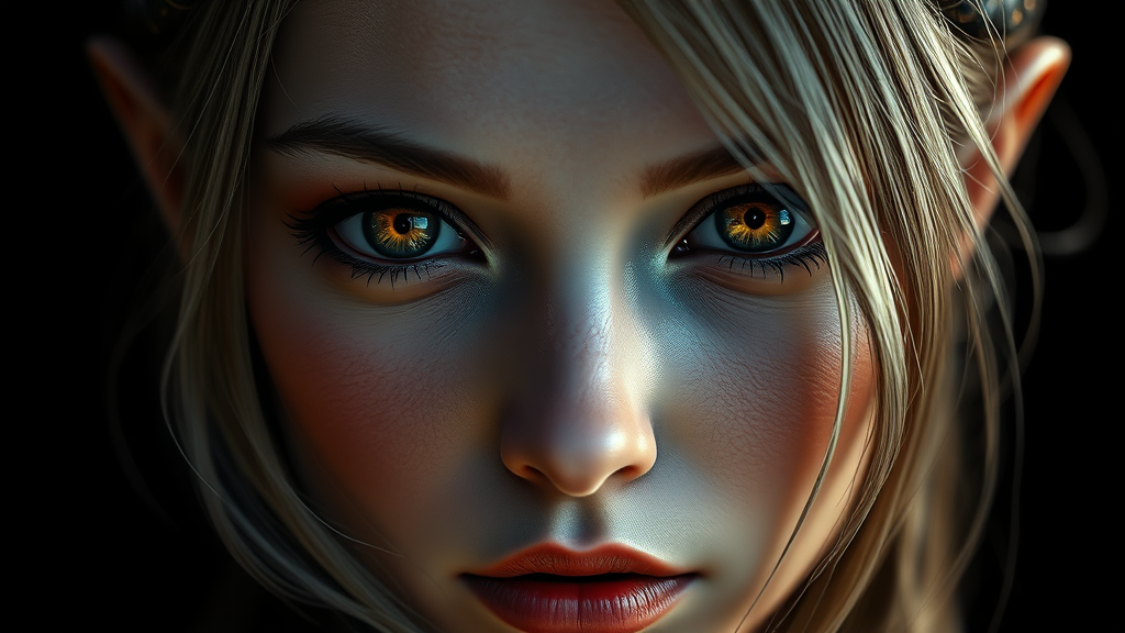 A captivating portrayal of a stunning elven healer set against a deep black background, featuring mesmerizing, realistic reflective eyes with perfect irises. Her striking, feminine facial features exude allure and subtle elegance. Crafted in the style of David Kassan and Ismail Inceoglu, this hypermaximalist artwork emphasizes volumetric lighting and boasts award-winning qualities. Rich in deep colors, presented in 8k UHD HDR for ultimate clarity. The image retains a singular, flawless composition with no duplicate or disfigured elements, avoiding any undesirable mutations, deformations, or distortions. Attention to detail ensures a clear, unblemished presentation, free from low resolution, blurriness, or digital artifacts, maintaining the integrity of the portrait without distractions.