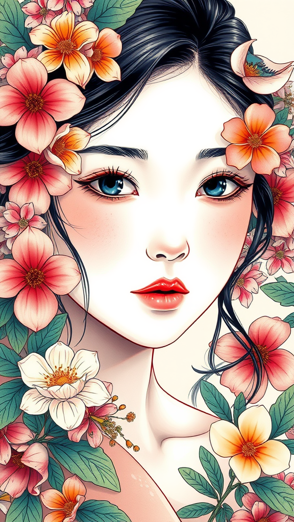 A captivating portrayal of an enchanting Japanese girl adorned with an intricate array of vibrant flowers, radiating the elegance and finesse reminiscent of Artgerm's style. The composition embodies a fluidity in linework, enhancing the lush and detailed nature of her appearance. Her facial features are meticulously crafted, revealing her delicate and expressive demeanor. Set against a backdrop inspired by cottagecore aesthetics, the image exudes a harmonious connection to nature, drawing focus to her intense, close-up presence. The scene captures a mesmerizing blend of tranquility and vibrancy, with a palette that celebrates the subtle artistry and beauty of the natural world.