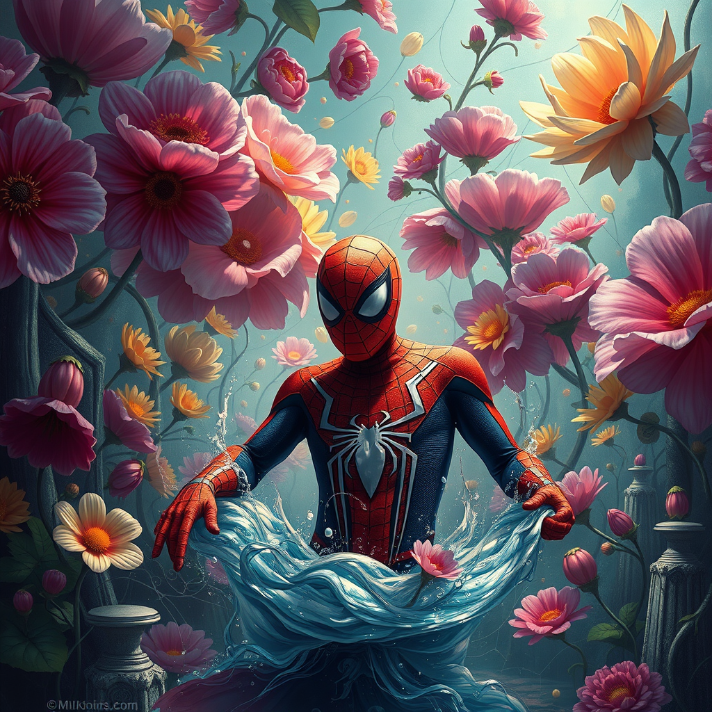 A captivating portrayal of Spider-Man navigating the underworld, enveloped by a vibrant array of surreal, fantastical flowers that suggest a regal presence akin to a flower king. The scene captures the essence of a modern-day genie with ethereal and mystical elements intertwined. Tom-like figures add a touch of whimsy amid the intricate design inspired by rococo and contemporary art trends. The artistry employs Rembrandt lighting to highlight Spider-Man's contemplative expression, blending realism with a dreamlike atmosphere.