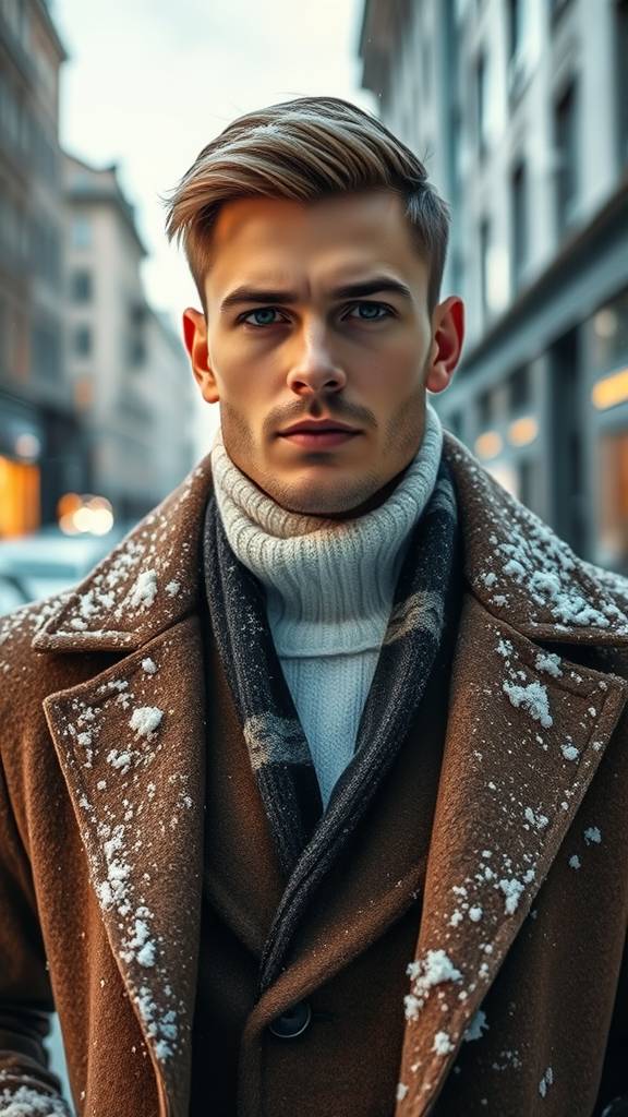 A captivating professional portrait photograph of a strikingly handsome Norwegian man dressed in stylish winter attire, posed outdoors on a snow-covered city street. The scene captures a stunning and modern urban upscale environment, portrayed with ultra-realistic precision, and concept art techniques. The image is elegant, impeccably detailed, and intricate, showcasing sharp focus with a shallow depth of field at f/1.8 using an 85mm lens. The composition is a medium shot, highlighting the subject amid bright, soft diffused light with a hint of volumetric fog, creating an ethereal atmosphere. This portrait is trending on Instagram and Tumblr, produced in high-definition 4K and 8K with HDR quality, ensuring exceptional clarity and vibrancy, subtly enhanced by creative flair while maintaining the core essence of the scene.