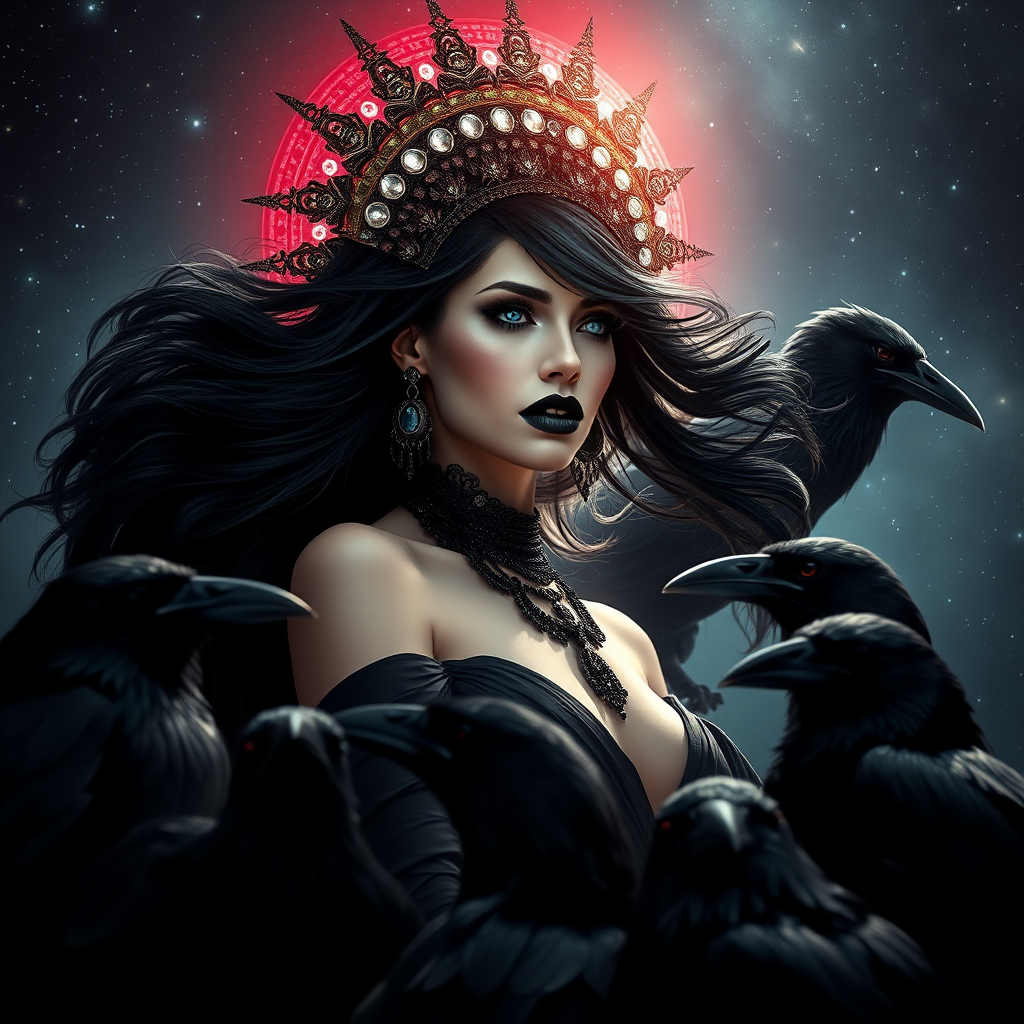 A captivating queen of ravens stands in dramatic action, embodying the essence of a femme fatale with her black plumes and captivating presence. Her black lipstick and icy blue eyes, reminiscent of Pantone 2766, enhance her striking black hair that flows like a dark river. In a scene inspired by the mystical realms of World of Warcraft, she gracefully commands her ravens, enveloped in a psychedelic aura that hints at secrets born from the depths of a cosmic birth canal. Clad in a silk gossamer dress that dances with the whispers of the stars, she is framed against a galaxy-studded backdrop. The full-body portrait captures her in the ethereal elegance of Greg Rutkowski's style, crowned with an ornate, otherworldly headpiece. Viewed from a low angle, god rays and radiant light imbue her with a divine presence, set against an iridescent red halo. The environment is ultra-realistic, giving life to a detailed narrative infused with gothic beauty. It's a world of dark fantasy and atmospheric hyper-realism, echoing the macabre, yet illustrating insane detail in an epic wide shot. This ultra-realistic illustration, captured with sharp focus via octane render, creates a cinematographic masterpiece.