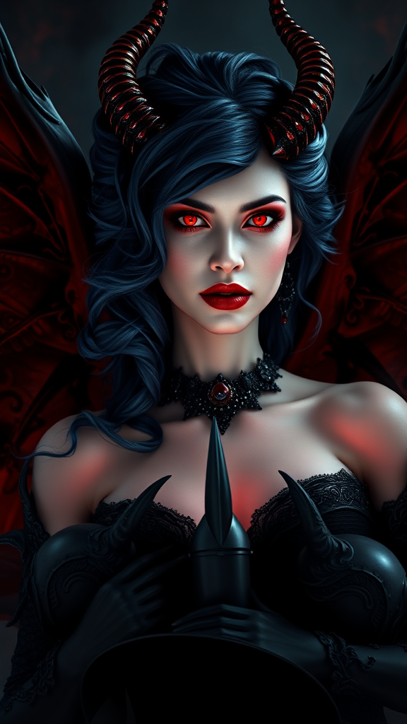 A captivating queen vampiress with ethereal sensuous alabaster skin exudes a beguiling allure, her lips painted in a deep scarlet, offset by cascading waves of midnight blue hair. Her piercing crimson eyes, both mesmerizing and intimidating, hold a gaze that commands loyalty and fear. Resplendent jet red horns crown her head, while six arching wings spread majestically, casting shadows upon a retinue of subservient vampires who bow in reverence. The scene is enveloped in an atmosphere of dark, morbid gothic intensity, damp and dense with a dramatic tension that hangs in the air. Her presence is a hyperornate spectacle against a backdrop of intricate, epic landscapes, the whole setting rendered in exquisite, photorealistic detail. Volumetric lighting enhances the hyperrealism, creating a sense of depth and mystery. This hypermaximalist depiction, achieved with the power of Unreal Engine 5, captures her as the ultimate femme fatale, a glamorous shot brimming with passion and an unsettling charisma that both intrigues and intimidates.