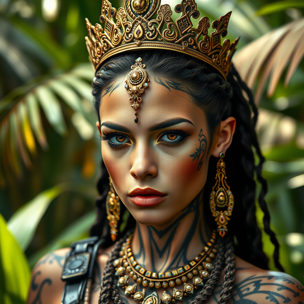 A captivating, realistic photograph captures a three-quarter full-body portrait of a warrior queen, featuring intricate, highly detailed ornamented robotic parts. Her ornate crown sits regally atop her head, complementing her intense, piercing eyes. Exquisite jewelry adorns her, accentuating the tribal tattoos that tell her story. Set against a lush jungle backdrop, the portrait is in sharp focus with soft lighting highlighting the natural skin texture, including subtle pores and a beauty spot. The image showcases realistic reflections and extremely detailed skin, taken with an 80mm lens at f/1.2, reminiscent of a National Geographic feature. Her elegant long neck and commanding presence hold the viewer's attention, with a well-proportioned figure. The lighting casts strong shadows that add depth and drama. Unique scars hint at her battles, while the palette is vibrant without being oversaturated, maintaining a natural beauty.