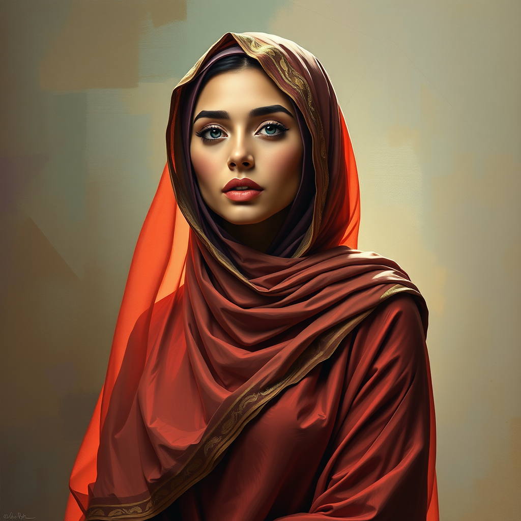a captivating rendition of a Muslim Arab woman, reminiscent of a model shoot, in a full-body pose, exuding elegance and grace. This stunning depiction is crafted in the style of a majestic oil painting, drawing inspiration from renowned artists like Ed Blinkey, Atey Ghailan, and Studio Ghibli. The work captures the allure and sophistication associated with iconic painters such as Jeremy Mann and Greg Manchess. The painting is intricate, boasting high detail with sharp focus, and evokes a dramatic, photorealistic feel. It is a trending masterpiece on platforms like ArtStation and CGSociety. The artwork highlights an interplay of vibrant and unconventional colors, with an emphasis on precise anatomy and graceful proportions, ensuring a balanced depiction without distortion or disfigurement. This painting seeks to celebrate beauty and culture in a harmonious composition, skillfully avoiding elements like digital art pitfalls or excessive surrealism.