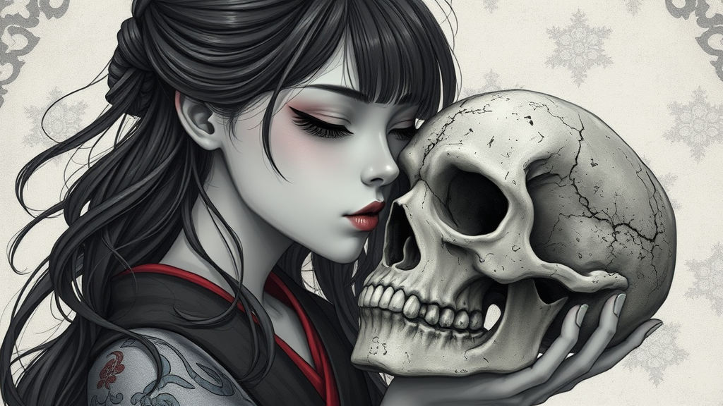A captivating scene depicting a woman in a gothic, Japanese-inspired setting, tenderly kissing a weathered skull. The artwork reflects the intricate style of Andreas Rocha, blending gothic and anime-inspired elements with realistic detail. Her delicate kimono, adorned with crimson and gray patterns, contrasts against the monochrome background. Her hair flows elegantly, framing her pale, expressive face with large, soulful eyes that convey a deep connection to the past. The skull is intricately detailed, its hollow eyes hinting at secrets untold. The composition is a harmonious blend of fantasy and realism, with a haunting yet beautiful atmosphere.