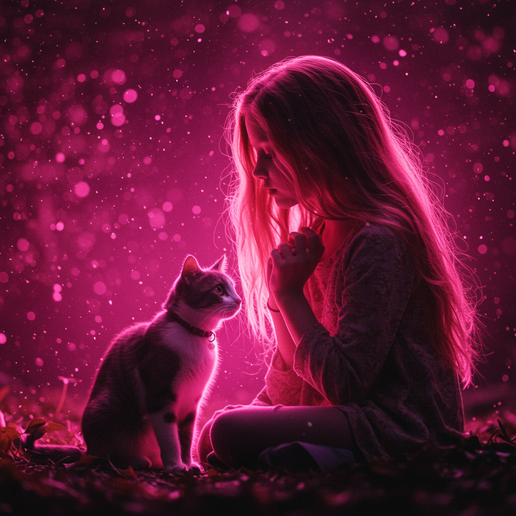 A captivating scene featuring a girl with flowing hair and a striking cat by her side, both bathed in a soft pink glow. The image is cinematic and rendered in ultra-high 4k resolution, revealing intricate details in their expressions and surroundings, creating a sense of magical realism and serenity.