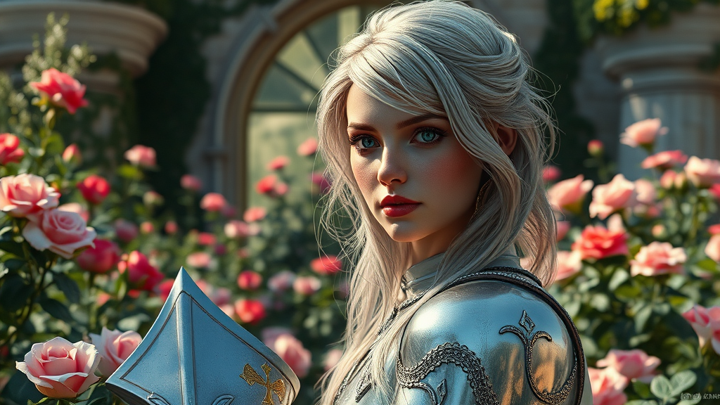 A captivating scene featuring a graceful lady in a castle garden, her angelic face framed by dark silver-blonde hair and a single green eye glistening with intrigue. She stands amidst a sea of roses and vibrant flowers, her presence complemented by a silver knight's armor that gleams softly in the dappled sunlight. The atmosphere blends classic beauty with a touch of fantasy, evoking a sense of timeless elegance. The image, inspired by high-quality art from platforms like CGSociety and ArtStation, captures the enchanting essence of the moment without unnecessary embellishments, presented in a realistic 3D rendering style.