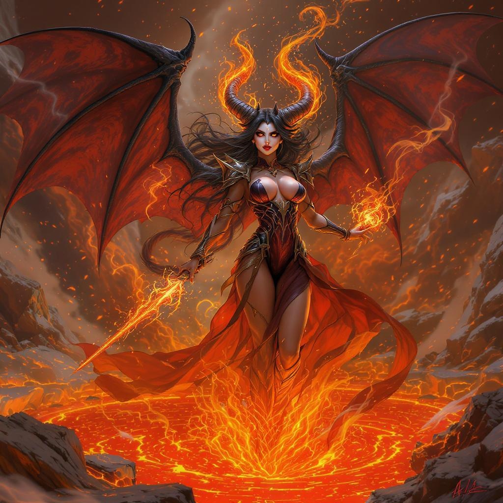 A captivating scene featuring a striking female succubus with mesmerizing batwings and flames cascading from her hair, ascending from a pool of magma. Her face is depicted with lifelike, highly detailed features, exuding an aura of magic and fantasy. The environment is filled with swirling particles, evoking a dreamy, D&D-inspired atmosphere. The wide-angle composition captures the vibrant colors of fire and lava, blending into a vivid and fiery palette. The succubus dons a flowing gown, artfully holding a wand. Elements of photorealism shine through, with influences from celebrated artists like Artgerm, Greg Rutkowski, Alphonse Mucha, Loish, and WLOP. The background is intricately detailed, showcasing a fantastical landscape. The scene is rendered in a crisp 8K resolution, with professional digital painting techniques, trending on platforms like Tumblr and ArtStation. Additional characters are featured, each with distinctive features, contributing to the mystical and enchanting narrative, avoiding unrealistic proportions or distortions.