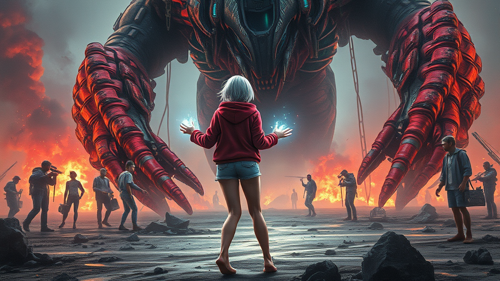 A captivating scene featuring a young woman with shimmering silver short hair peeking from beneath a chic hooded crimson jacket, clad in short denim shorts, her bare feet grounded as she confronts a colossal creature in a post-apocalyptic world. Strange, ethereal energy pulses from her hands, illuminating the chaos around her. This hyperdetailed painting, inspired by luminism and octane render techniques, showcases bar lighting effects, combining complexity with an 8k resolution concept art portrait. The piece draws stylistic influences from artists like Martina Fačková, Prywinko Art, Artgerm, WLOP, Alphonse Mucha, and Tony Taka, incorporating fractal isometric details and bioluminescent elements. The hyperrealistic cover photo is vibrant and gritty, akin to works by Da Vinci and Erté, in 12k, featuring intricate, high-definition cinematic effects. The rough sketch intertwines bold dark lines with loose, expressive strokes, capturing the raw energy of the scene on paper, reflective of a real-life human experience, with minor creative twists to enhance the narrative while maintaining the core essence.