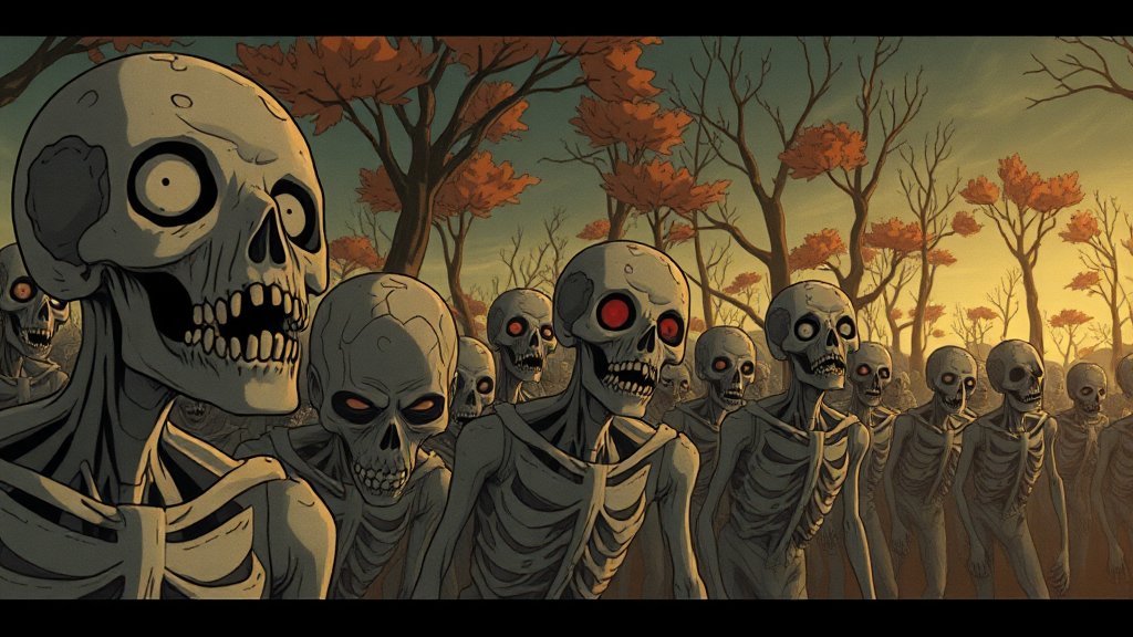 A captivating scene from a retro anime film, imagined as a DVD screengrab, features a horde of zombies intricately designed by the legendary Hayao Miyazaki. The image combines the whimsical, detailed artistry of Studio Ghibli with an eerie horror theme. Muted, hand-drawn animation style with rich autumnal colors sets the tone, portraying a post-apocalyptic landscape where ethereal creatures wander. The characters' expressions convey a haunting yet oddly serene aura, blending the fantastical with the chilling in a uniquely nostalgic atmosphere.
