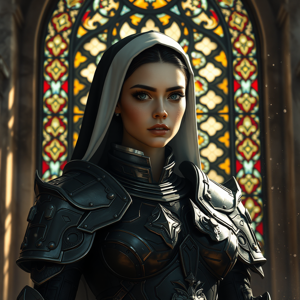 A captivating scene of a devout Sister of Battle set against the backdrop of an intricate stained glass window. A beautiful warrior woman, clad in elaborate sci-fi nun armor reminiscent of Warhammer 40k, stands with a poised demeanor. Her symmetrical face is framed by dark eyebrows and enhanced with mascara and subtle makeup, exuding strength and grace. Her reflective eyes hold an intense gaze. The setting is an awe-inspiring space with marble walls where dust particles dance in the air, captured in detailed, dramatic chiaroscuro lighting that adds depth and majesty. This impressionistic scene evokes a blend of influences from Waterhouse to Studio Ghibli, with a nod to modern masters like Jeremy Mann and Greg Manchess. The steel and medieval elements of her armor are thoughtfully rendered, and an impression of historic majesty is conveyed in this trending art piece on platforms like ArtStation and CGSociety.