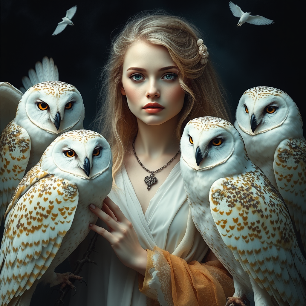 A captivating scene of a woman surrounded by her owls, exuding an ethereal beauty. Her porcelain skin contrasts with the dark white and light azure hues of her surroundings. Styled in the manner of Clifford Coffin with influences from the Northern Renaissance, she is adorned in flowing garments that blend white and amber tones. The atmosphere carries a subtle Wiccan aura, evoking a sense of mystical elegance and timeless grace.