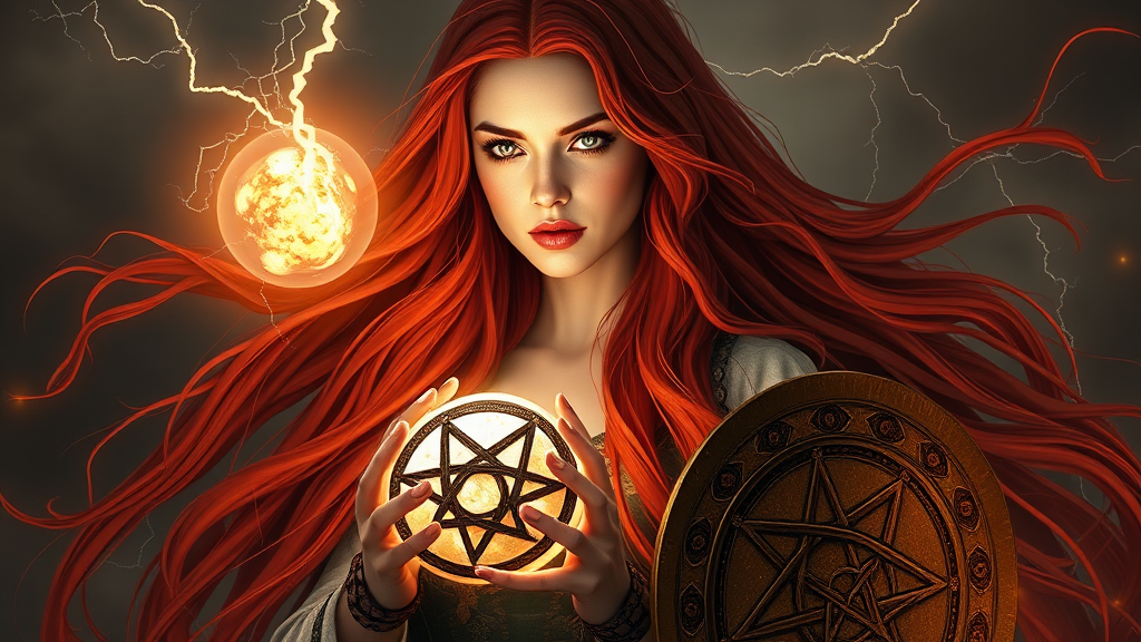 A captivating scene of a woman with very long flowing red hair, reminiscent of Amy Adams, holds a radiant, glowing sphere in her hands. Her eyes gleam with wisdom as she exudes the aura of a lightning mage, with an intricate pentagram shield resting at her side. Her presence combines elements of a benevolent android necromancer and the high priestess tarot card, embodying a blend of mysticism and advanced technology. She stands as a portrait of a Celtic goddess, akin to Diana, capturing the ethereal essence of an anime goddess. The artwork, rich in fantasy elements, would find its place on platforms like CGSociety and ArtStation, where her mythical yet modern demeanor captivates the viewer's imagination.