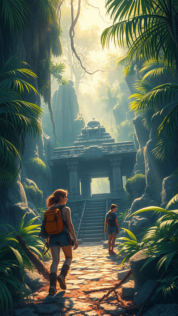 A captivating scene set in the 1980s where a fearless female adventurer stumbles upon an ancient temple ruin deep in the heart of a lush jungle. The atmosphere is volumetric, capturing the essence of a mystical discovery, with intricate and highly detailed elements bringing breathtaking beauty to life. Precise lineart highlights the stunning composition, with vibrant colors and comprehensive cinematic elements reminiscent of Carne Griffiths and Conrad Roset's styles. Dappled sunlight filters through the dense canopy, creating a captivating play of light and shadow. While maintaining a photorealistic feel, the image avoids low resolution, text errors, and any anatomical inaccuracies, presenting a flawless depiction of exploration and wonder.