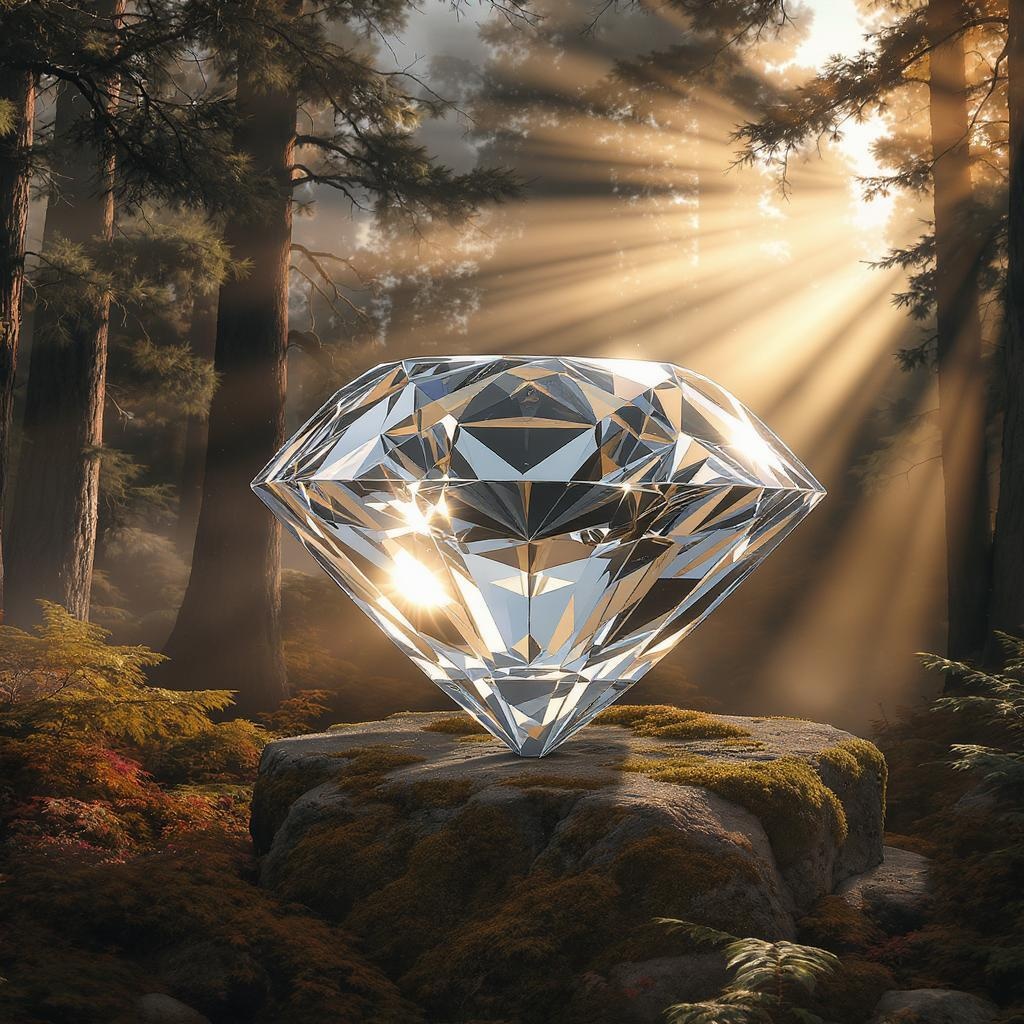 A captivating scene unfolds as a massive transparent diamond rests atop a weathered stone pedestal, encircled by an enchanting forest. The rising sun casts a golden glow through the trees, illuminating the diamond's facets with cinematic lighting, creating a breathtaking and epic atmosphere. Rendered in hyper-realistic detail with an 8k resolution, each facet of the diamond reflects its surroundings, bringing the scene to life in exquisite clarity. The interplay between light and shadow, combined with the rich textures of the forest, evokes a sense of wonder, enhanced by the advanced technology of unreal engine 5. This cinematic portrayal captures the essence of nature's majesty in stunning focus and unparalleled detail.