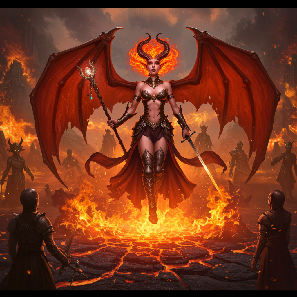 A captivating scene unfolds as a real-life female succubus with bat-like wings and fiery hair emerges gracefully from a swirling blaze of fire and molten lava. Her intricately detailed face exudes both allure and mystique, embodying the essence of fantasy and magic. Hovering in mid-air, she is surrounded by a dreamlike aura created by particle effects that add a touch of mystery to the setting. The scene is captured with a wide-angle perspective, revealing a meticulously detailed background that enhances the lifelike quality of this professional digital painting—a work that could be found on ArtStation or trending on Tumblr. The succubus is dressed in a stunning gown, holding a wand and sword among other accessories, with crisp lighting highlighting the fiery colors of the composition. The art style draws influence from renowned artists like Artgerm, Greg Rutkowski, Alphonse Mucha, Loish, and WLOP, combining elements of photorealism and concept art to create an 8k masterpiece. In the backdrop, multiple figures are subtly visible, adding depth to the canvas without detracting from the central figure's prominence.