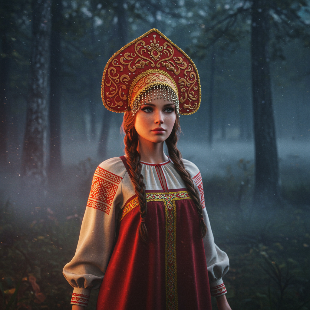 A captivating scene unfolds in a misty forest under the night sky, showcasing high-detail digital painting inspired by the works of Artgerm, Greg Rutkowski, and Alphonse of the Fly. The focal point is a girl adorned in a meticulously carved red kokoshnik, embellished with a stunning golden ornament. She wears a traditional Russian folk dress, and her perfect anatomy is highlighted with hyper details. The composition is cinematic and photobashed with epic precision, featuring octane render quality that ensures extreme detail. The scene undergoes expert post-processing, denoise, and upbeta techniques to create a smooth, clear focus. The ethereal atmosphere blends with the aesthetic of Artstation concept art, offering a breathtaking, seamless view that mesmerizes the viewer.
