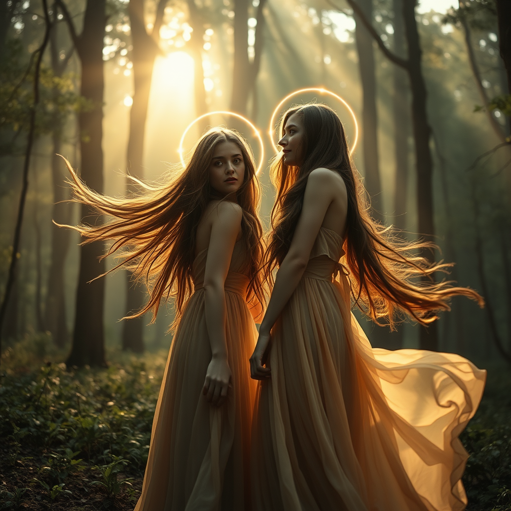 A captivating scene unfolds in a mystical, enchanting forest where young women with flowing long hair stand gracefully. They wear vintage dresses that cascade with elegance, their figures perfectly proportioned. The air is aglow with a mystic light, casting incandescent halos around them, enhancing their ethereal beauty. A cinematic composition captures the scene dramatically, marrying heavenly, divine, and celestial elements. The atmosphere is rich with an aura of melancholy and mystery, reminiscent of Elly May's style. The details are exquisitely refined, presented in ultra high definition and hdr, capturing every nuance in ultra hd 8k resolution. The forest seems to whisper ancient secrets, creating a spellbinding, otherworldly experience.