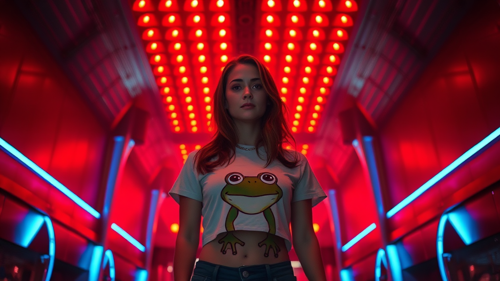 A captivating scene unfolds with an alluring woman in a stylish cropped t-shirt adorned with a playful frog design, standing confidently in front of the iconic Watergate complex. The environment is bathed in an atmospheric, cinematic mood, with the ceiling above masked by a grid of vivid red lights casting an intense glow throughout the space. Both the walls and support beams feature sleek blue accents, enhancing the nightclub-like ambiance. The colors and arrangement blend together, creating a mesmerizing play of light and shadow that adds depth to the captivating nightlife scene.