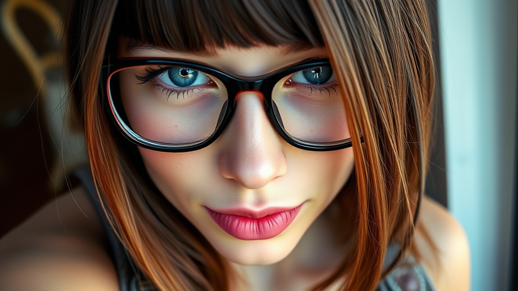 A captivating selfie of a stunning girl with mesmerizing dark blue eyes and straight chestnut brown hair. Her elegant, stylish glasses frame her face, drawing attention to her beautifully freckled complexion. A shade of vibrant pink lipstick highlights her subtly chapped lips, complementing her flawlessly slender nose. Dressed in chic leather overalls, she exudes a sense of morning freshness. Captured with a 1.4mm lens, the sharp focus accentuates her striking eyes, while the image playfully tweaks imperfections, creating an intriguing blend of artful quirks.