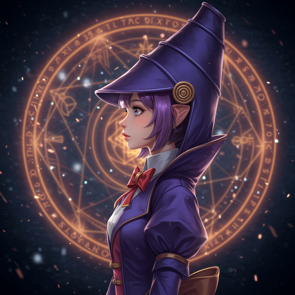 A captivating side profile of a slender, enchanting young girl with an exquisite, ethereal face resembling an innocent princess. She is adorned in intricately detailed magician's attire inspired by Japanese mysticism, her large, expressive eyes conveying a sense of wonder. She stands against the backdrop of a highly detailed magical portal, surrounded by an aura of witchcraft and luminescent reflections. The scene is illuminated with complex cinematic lighting, casting a mystical glow that enhances the magical atmosphere.