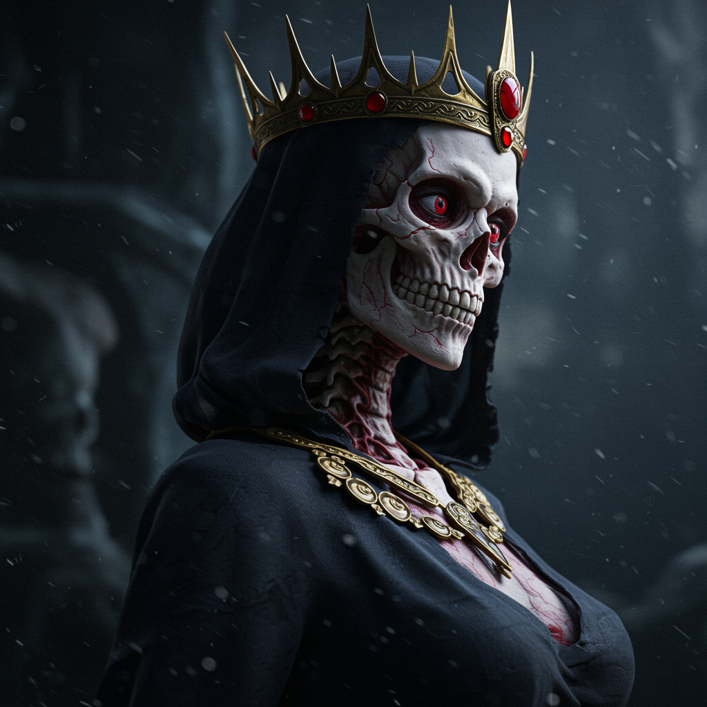 A captivating skeleton woman adorned in regal attire, reigning as queen of the underworld. Her eye area is vividly colored, with hollow eyes that tell tales of blood and veins intertwining. The living dead, morbid yet mesmerizing, she embodies an unholy elegance in this fantastical realm. The scene is an extremely intricate, cinematic masterpiece, hyper-realistic and hyper-detailed, bringing absurd resolution to life in 4k, 8k, UHD, HDR quality. Rendered with octane precision, her sideways pose captures the essence of surreal beauty. Amidst the living and the dead, her presence is both haunting and fascinating, captivating all who glimpse her world.