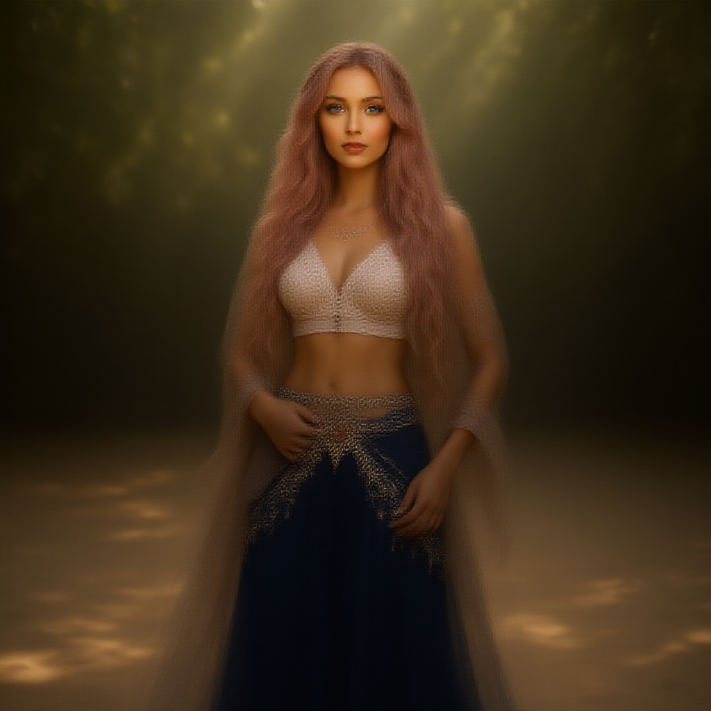 A captivating, slender woman with a toned, muscular abdomen stands gracefully in a secluded sand dance pit, her waist-length dusty rose hair cascading around her. Her radiant, bright blue eyes exude a serene yet confident expression. She is adorned in an intricately embroidered and richly embellished belly dancing ensemble—a top and deep indigo bottom that glistens in the light. The sun filters through the canopy above, weaving a tapestry of dappled shadows, while a warm torchlight casts gentle highlights on her and the surrounding textures. Her sultry, contemplative gaze locks onto the viewer, inviting them into her world. Viewed from a low, wide angle, the scene emphasizes her magnetic presence, reminiscent of a Luis Royo masterpiece.