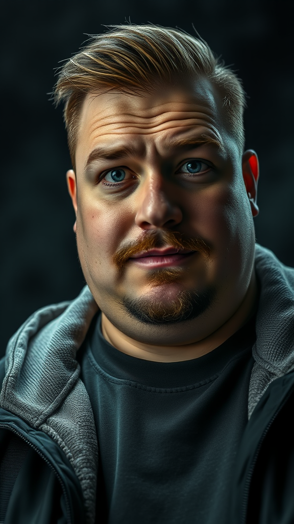 A captivating three-quarter close-up portrait of a stunningly handsome 30-year-old man with an overweight figure and a striking face, exuding a curious and friendly expression. He sports a tidy goatee and well-groomed hair. The scene is set against an oppressive and contrasting background, dramatic and expressive, filled with a gloomy horror atmosphere. It's a cinematic shot, captured from a low angle with professional DSLR settings: aperture f/7, shutter speed 1/100 sec, and ISO 150. The image is super detailed and hyper photorealistic, characterized by natural reflections and cinematic anime lighting. Despite the intense atmosphere, the man's presence is prominent, standing in stark contrast to the oppressive background. Emphasizing a surreal and dramatic setting without compromising his genuine and approachable aura.