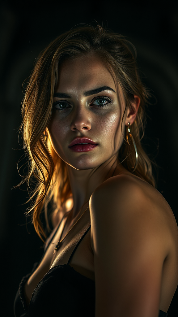 A captivating three-quarter close-up portrait of a stunningly beautiful 30-year-old woman with a slender, athletic figure and an intriguing, frowning yet innocent expression on her face. Her hair cascades in soft waves, adding to the complexity of her look. She stands against an oppressive and contrasting background, creating a sense of dramatic tension with its gloomy, horror-infused atmosphere. The cinematic shot is taken from below, capturing the scene through a DSLR with an aperture of f/7, a shutter speed of 1/100 sec, and ISO 150, resulting in a hyper-photorealistic image with exquisite texture and natural reflections. The lighting is theatrical, with bright, almost blinding backlighting that enhances the depth of the narrative. The ensemble is complete with intricate details and sophisticated textures, embodying elements of symmetry and cinematic lighting, while deliberately steering clear of illogical or distorted anatomy elements, ensuring the scene remains captivating and artistically authentic.