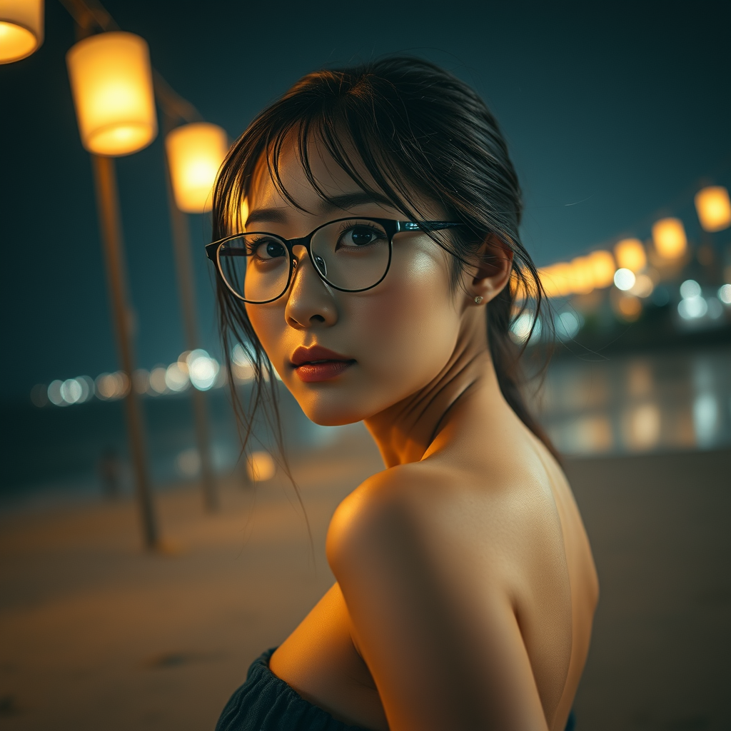 a captivating three-quarter close-up portrait of a stunningly beautiful 30-year-old Asian woman with an athletic figure and a serene, gentle expression. She wears glasses and gazes thoughtfully into the distance, with her hair damp from the sea breeze. The scene unfolds on a quiet beach at night, around 11pm, with an atmospheric backdrop of glowing lanterns casting a cool, ethereal light. In the distance, the lights of a nearby town add depth to the cinematic view. The shot is taken from a low angle with a DSLR camera, employing a wide-angle lens. The settings include an aperture of f/8, a shutter speed of 1/250 sec, and ISO 100. She is artistically lit from behind to the side, enhancing the hyper-photorealistic detail of natural reflections and textures. The overall effect is a cinematic anime aesthetic, exuding elegance without distortions or awkward proportions, while avoiding any elements of duplication or deformity.
