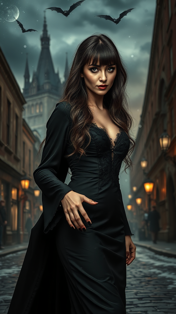 A captivating vampire woman elegantly traverses a Victorian city in the heart of winter, her presence both enchanting and mysterious. She exudes an air of timeless beauty with her long, luxurious hair framing a perfectly symmetrical face adorned with delicate bangs. Her open-mouthed smile reveals hints of her nocturnal nature, and her reflective eyes, intensified by mascara and expertly applied makeup, glisten with intrigue. The scene is rich in atmosphere, with dust particles dancing in detailed, dramatic lighting that creates a striking chiaroscuro effect against her black vampire dress. Her look is completed with manicured black fingernails and high heels, accentuating her graceful stride as she navigates the cobblestone streets. In the backdrop, a gothic castle looms under a starlit night sky, where bats flit among dark clouds, adding to the enigmatic allure of the scene. This hauntingly beautiful composition is reminiscent of a masterful oil painting, blending the iconic styles of artists like Waterhouse, John Constable, and Antonio Moro, while also drawing inspiration from contemporary creators such as Jeremy Mann and Greg Manchess. Impressions of Studio Ghibli’s magic and the elegance of Makoto Shinkai's Kyoto are woven into the imagery, which is celebrated across platforms like ArtStation and CGSociety for its intricate detail and dramatic flair.