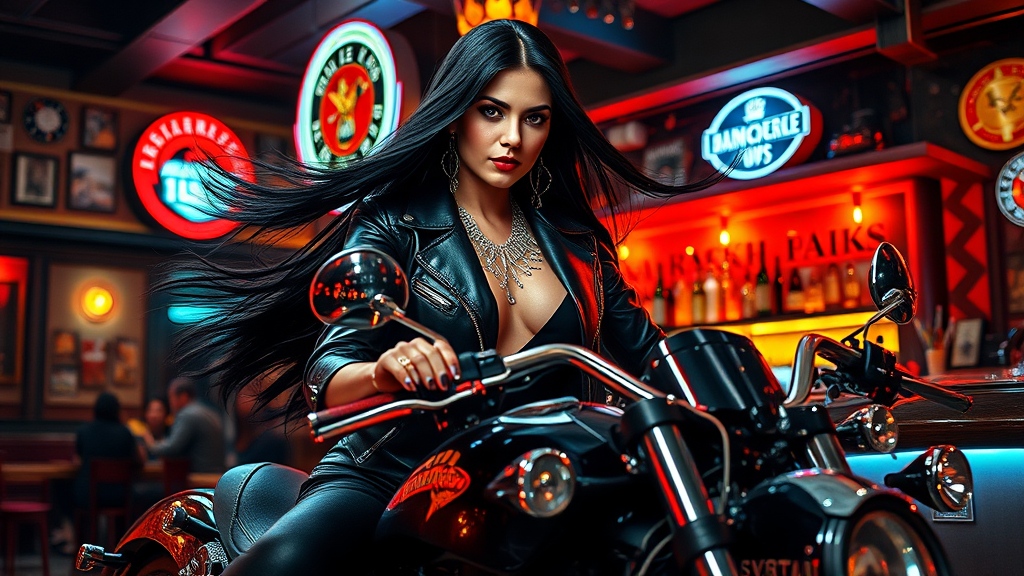 A captivating villainess with flowing black hair donning a sleek leather jacket and exquisite silver biker jewelry exudes confidence as she sits astride a powerful chopper motorcycle. The scene captures her in sharp focus with a bustling rock pub as the vibrant backdrop. This hyper-detailed photoshoot is a masterpiece in luminism, showcasing the intricacies of bar lighting. The complex portrait, envisioned in 32k UHD resolution, draws inspiration from the likes of Greg Rutkowski, Artgerm, and WLOP, infusing elements of edgy elegance and gothic allure with subtle fractal bioluminescent details, crafting an unforgettable atmosphere.