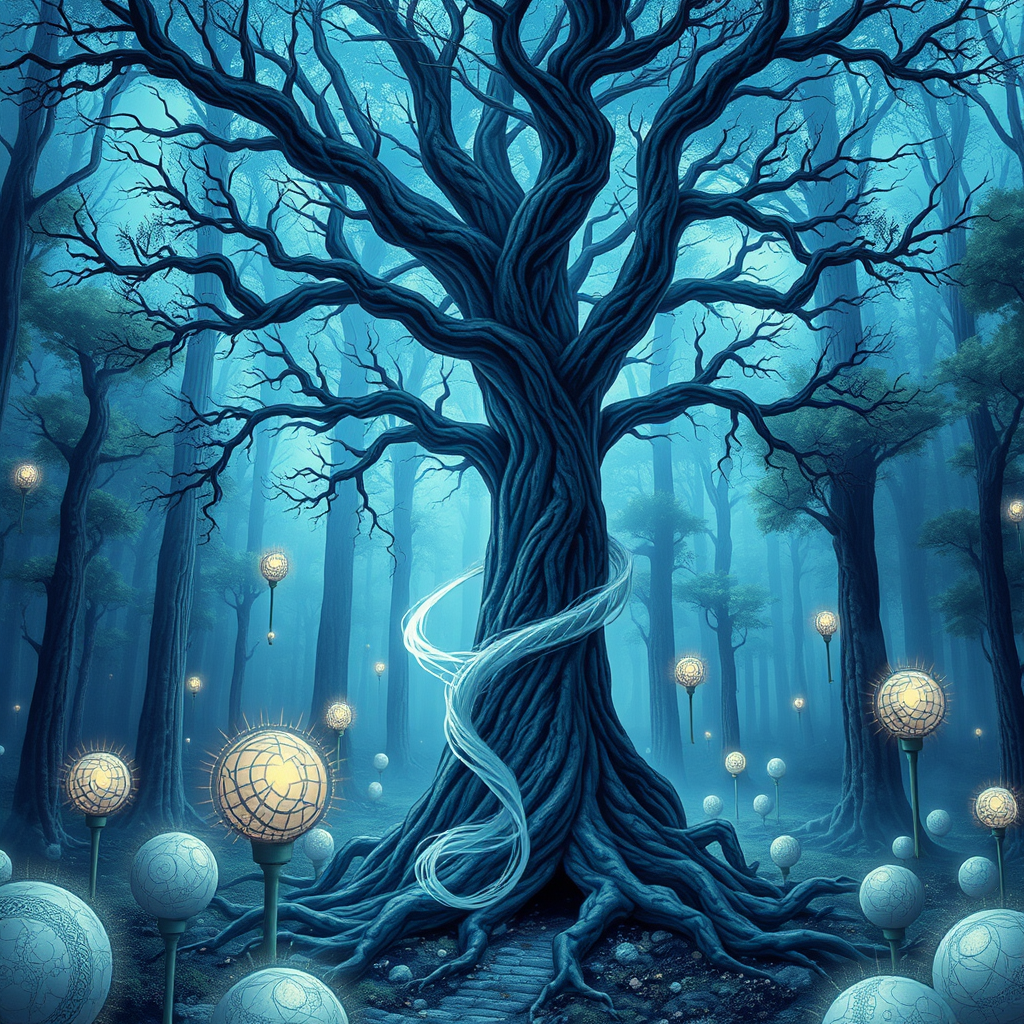 A captivating vision of a mystical forest, where a singular tree stands majestically with a spectral wraith entwined around its trunk, set amid visionary otherworldly beauty. The scene is adorned with intricate rhads and spherical sculptures that emanate a hypnotic aura. Light blue and indigo hues blend seamlessly, creating mesmerizing optical illusions that beckon the viewer into a realm inspired by the energy-filled illustrations of Dan Mumford. This ethereal landscape pulses with an enchanting energy, revealing hidden dimensions and inviting exploration, as the wraith and tree harmonize within this surreal environment.