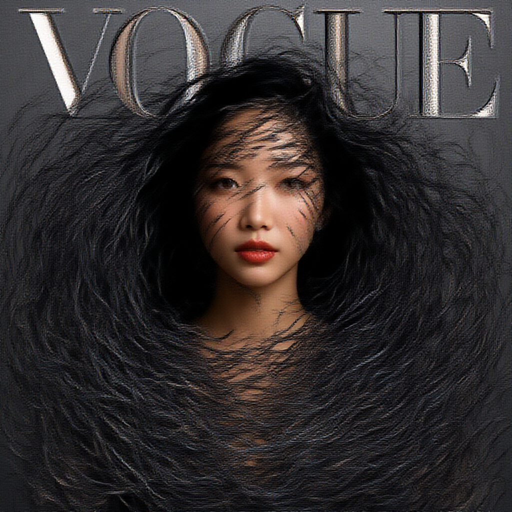 A captivating VOGUE magazine cover features a stunning Chinese woman enveloped in a mesmerizing whirlwind of swirling stripes. The dynamic lines coil and twist around her, seamlessly merging her silhouette with the surreal pattern. Her serene face, partially obscured by the hypnotic waves, exudes an ethereal, otherworldly charm. The striking VOGUE logo dominates the top, rendered in a metallic finish that stands out against the abstract design. Cover highlights include: "Stripes Reimagined: Fashion's Bold Revolution," "Surreal Elegance: The Fusion of Art and Style," and "Endless Patterns: Redefining Design Boundaries."