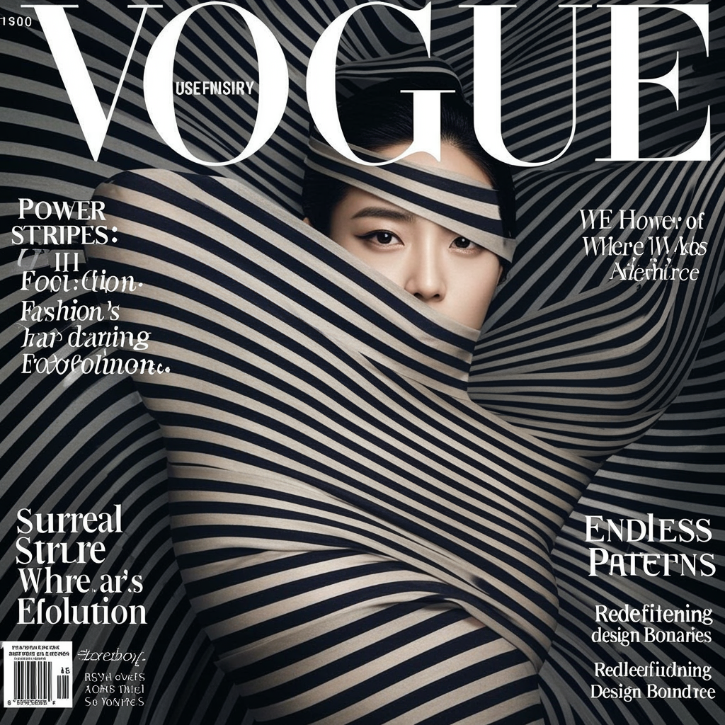 A captivating VOGUE magazine cover features an enchanting Chinese woman enveloped in a dynamic whirlwind of stripes. These lines twist and spiral, seamlessly blending her figure into a mesmerizing, surreal pattern. Her serene face peeks through the hypnotic layers, exuding an otherworldly elegance amidst the swirling stripes. The VOGUE logo is emblazoned at the top, metallic and eye-catching against the abstract backdrop. Cover highlights read: "The Power of Stripes: Fashion's Daring Evolution," "Surreal Allure: Where Art Meets Elegance," and "Endless Patterns: Redefining Design Boundaries."