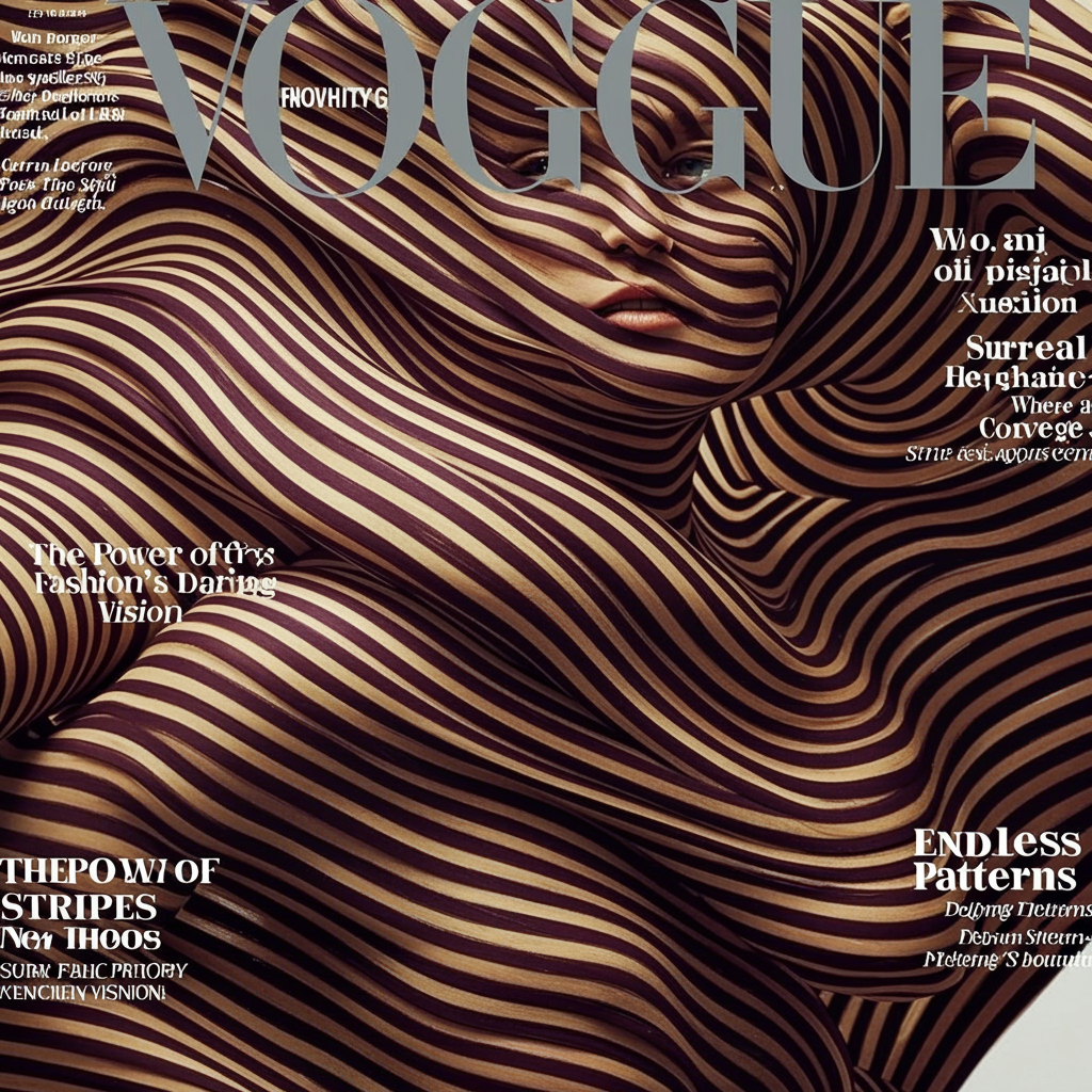 A captivating VOGUE magazine cover features an enchanting woman enveloped in a dynamic whirlwind of stripes. The lines twist and curve around her, seamlessly integrating her silhouette into the vibrant, dreamlike pattern. Her serene face is partially veiled within the mesmerizing waves of stripes, exuding an ethereal, otherworldly aura. The VOGUE logo stands bold and metallic at the top, contrasting powerfully against the abstract design. Cover highlights include: "The Power of Stripes: Fashion's Daring New Vision," "Surreal Elegance: Where Art and Style Converge," "Endless Patterns: Defying Design's Boundaries."