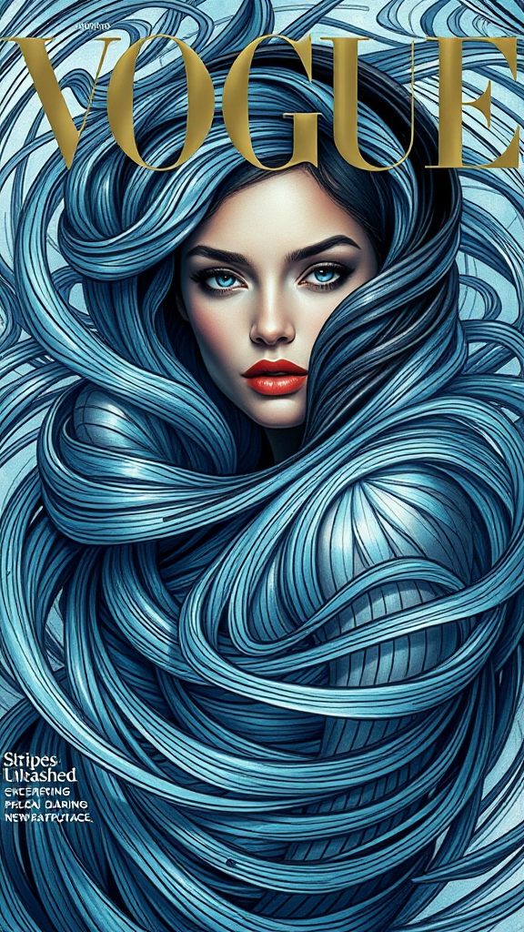A captivating VOGUE magazine cover showcases an enchanting woman enveloped in a mesmerizing swirl of swirling patterns. The dynamic lines coil and dance around her, seamlessly integrating her form into this surreal tapestry. Her expression is serene, with portions of her face obscured by the entrancing flow of patterns, giving her an ethereal, otherworldly aura. The iconic VOGUE logo stands at the top, rendered in a striking metallic finish that pops against the abstract background. Feature highlights include: "Stripes Unleashed: Fashion’s Daring New Wave", "Dreamlike Elegance: Where Art and Style Converge", "Endless Designs: Redefining Creative Boundaries".