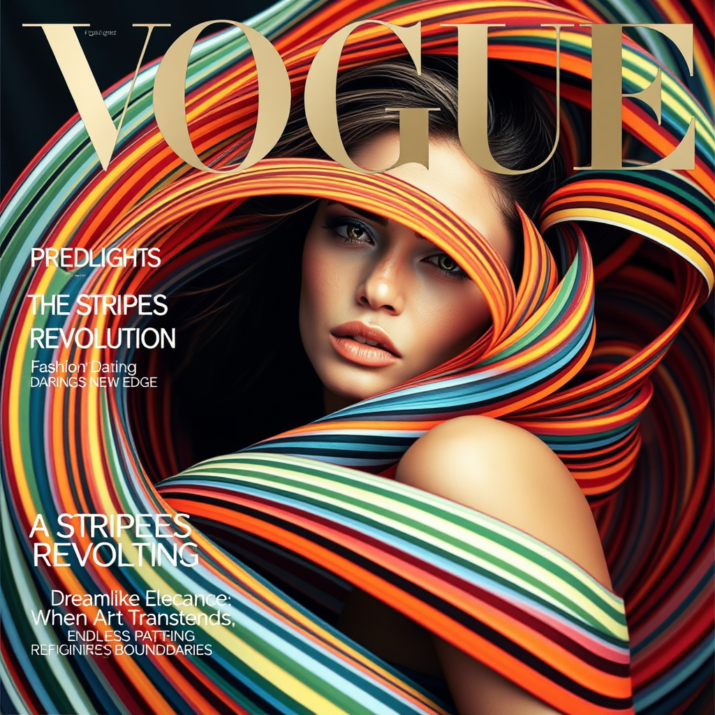 A captivating VOGUE magazine cover showcases an enchanting woman enveloped in a mesmerizing whirlwind of stripes. The lines weave and spiral gracefully around her, seamlessly blending her form into the vibrant, surreal design. Her expression is serene, with her face partially obscured by the mesmerizing waves of stripes, evoking an ethereal and otherworldly aura. The VOGUE logo is prominently featured at the top in a bold, metallic finish, standing out against the abstract backdrop. Cover highlights include: "The Stripes Revolution: Fashion's Daring New Edge," "Dreamlike Elegance: When Art Transcends Style," and "Endless Patterns: Redefining Design's Boundaries."