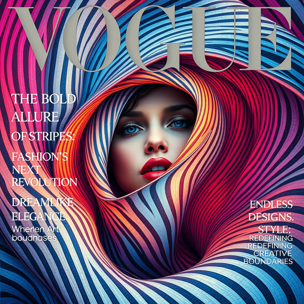 A captivating VOGUE magazine cover showcases an enchanting woman enveloped in a mesmerizing whirl of stripes. The swirling lines twist around her, seamlessly merging her form into the vibrant, surreal tapestry. Her face remains serene, partially obscured by the hypnotic waves of patterns, exuding an otherworldly, ethereal allure. The VOGUE logo stands prominently at the top, metallic and eye-catching against the abstract backdrop. Cover highlights include: "The Bold Allure of Stripes: Fashion's Next Revolution," "Dreamlike Elegance: Where Art Embraces Style," and "Endless Designs: Redefining Creative Boundaries."