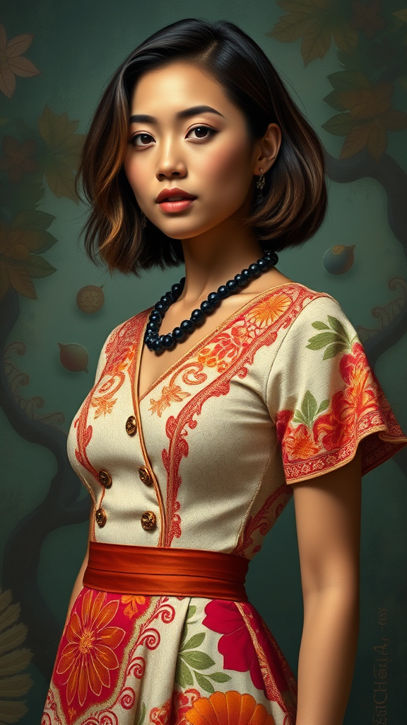 A captivating waist-up portrait of a stunning woman, adorned in a Pe'a-inspired gown featuring a tailored bodice and elegantly flared skirt, intricately embellished with traditional Polynesian designs. Her natural, radiant complexion accentuates her lively layered bob hairstyle. Her slender yet curvaceous figure is elegantly defined, while a quilt-like pattern graces her shirt, adding depth and texture. The artwork is infused with a dreamlike quality reminiscent of Anne Bachelier, blending ethereal elements with vivid hues to create a layered narrative that evokes both mystery and cultural richness.