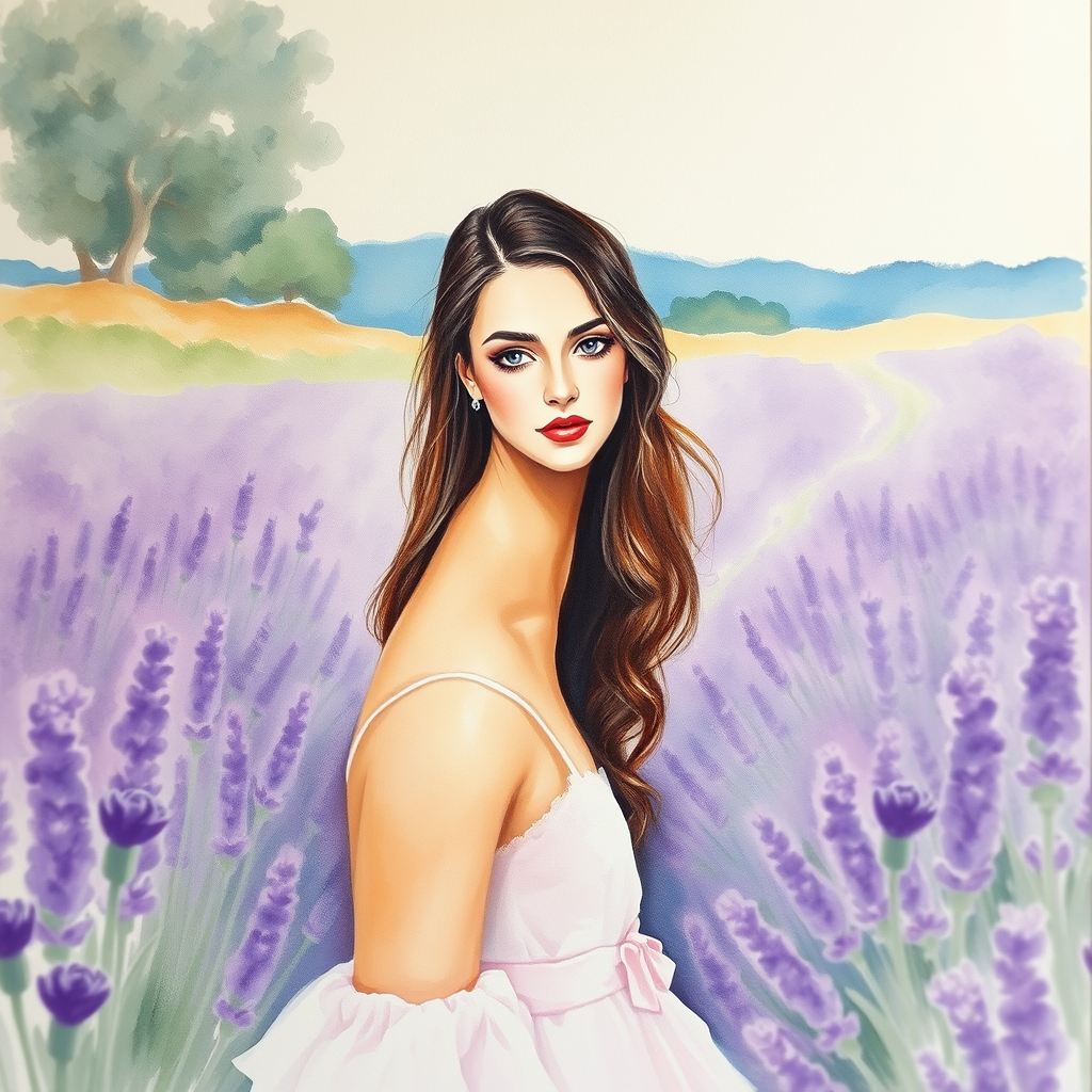 A captivating watercolor painting on canvas depicting an elegant woman, reminiscent of Claude Monet's impressionistic style, surrounded by vast lavender fields. The scene blends impressionistic landscapes and portraits with an emphasis on pastel colors. The exaggerated, blurry brushstrokes give a dreamlike quality to the composition. The balance between the serene beauty of the woman and the soothing hues of the lavender fields creates a harmonious and tranquil atmosphere, embodying the essence of impressionism with a gentle, artistic flair.